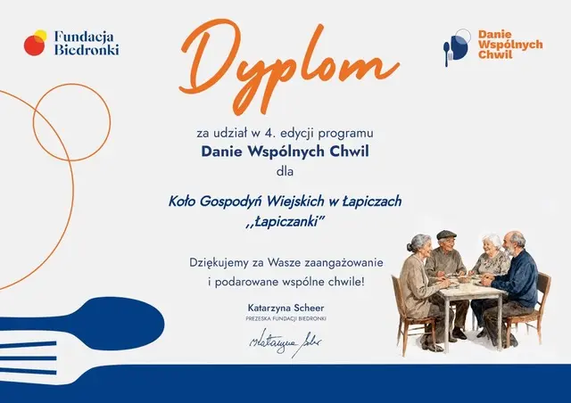 Koło Gospodyń Wiejskich w Łapiczach „Łapiczanki” otrzymało dyplom za udział w 4. edycji programu „Danie Wspólnych Chwil”, realizowanego przez Fundację Biedronki.